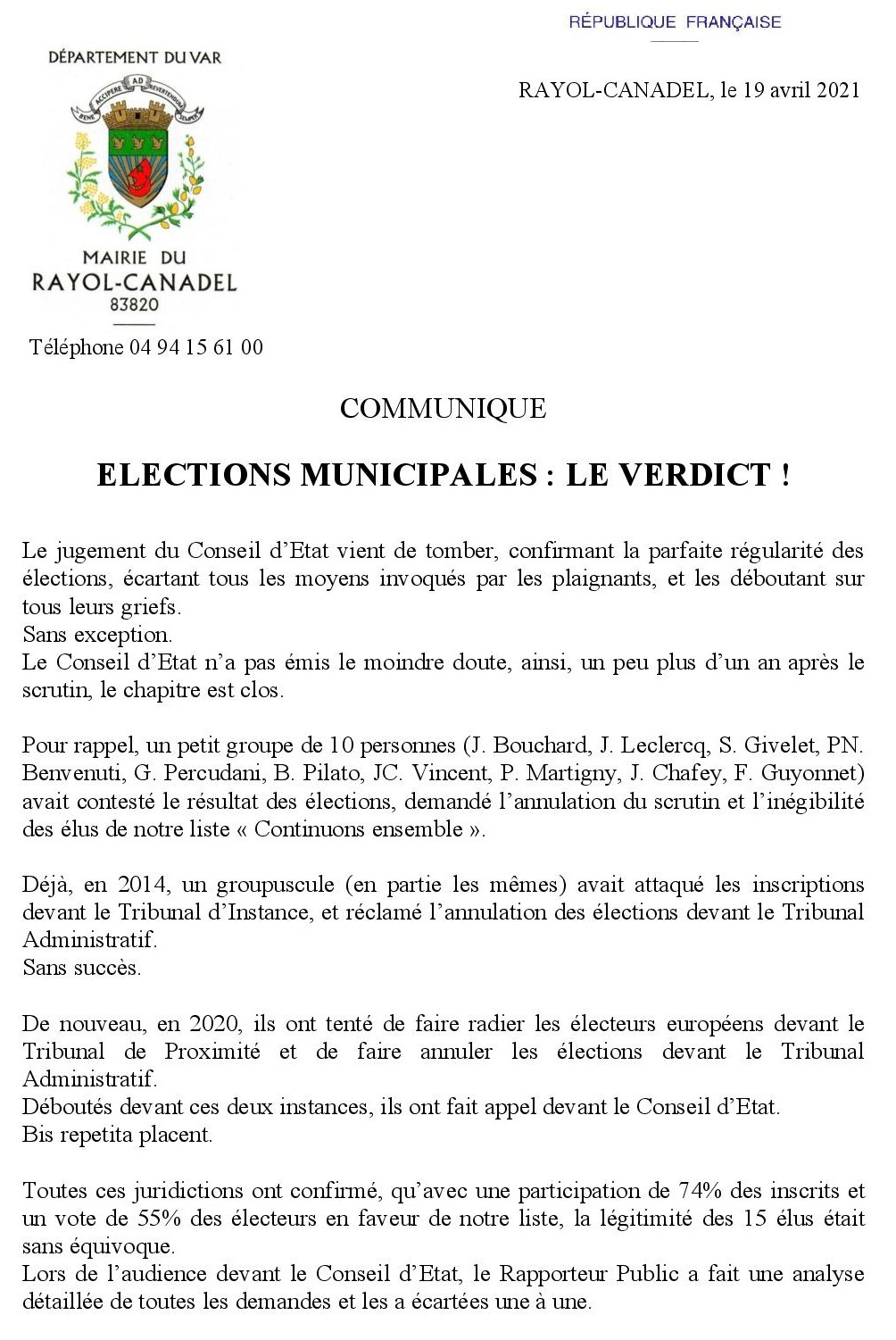 Le verdict final est tombé : le Conseil d'Etat a définitivement jugé la régularité des élections municipales, la légitimité de l'équipe élue le 15/03/2020 est confirmée.