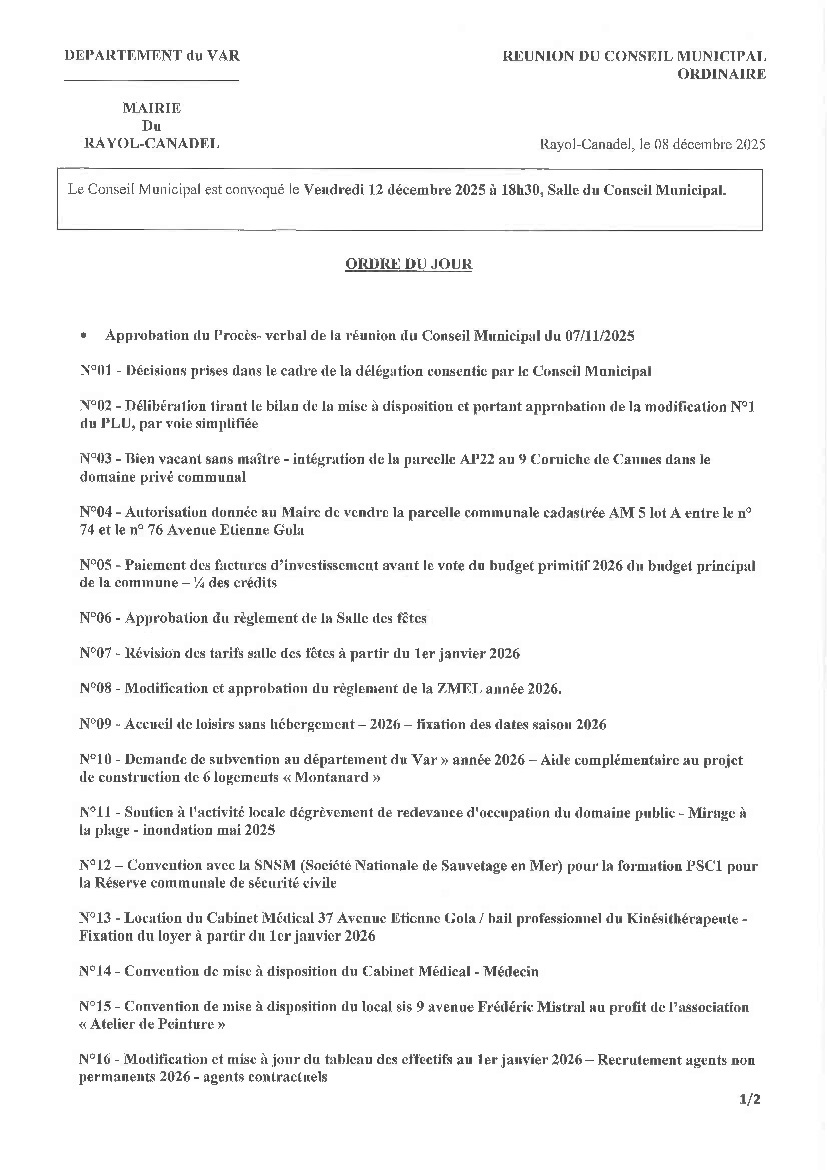 Le prochain conseil municipal se tiendra le vendredi 12 décembre 2025 à 18h30 dans la Salle du Conseil Municipal.