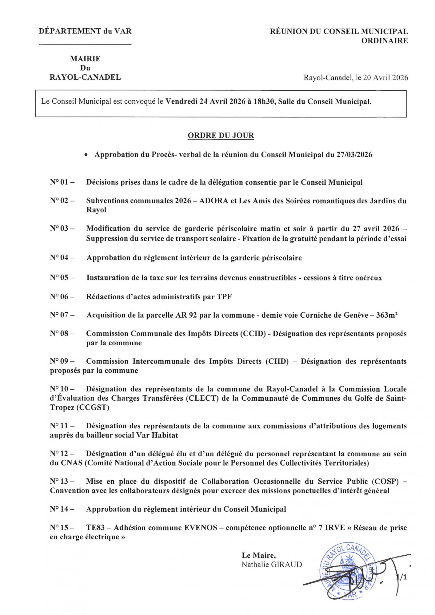 Le prochain conseil municipal se tiendra le vendredi 24 avril 2026 à 18h30 dans la salle du Conseil Municipal.